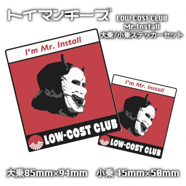 LOW-COST-CLUB Mr.Install ステッカー 【大乗/小乗各1枚】2枚セットです。 *画像はイメージです。実際の商品とは異なる場合があります* *アパレル商品とまとめ買いの際は、1月22日以降同梱での発送となります* ステッカー内容 トイマンチーズお馴染みMr.Installこと、 ジョー・般若 2級野良整備士をステッカーにしました! 大乗はクルマやボード、小乗はスマホやパスケースなどに 貼ると2級野良整備士気分が味わえます! 耐水性、耐候性に優れた高品質ステッカーです。 グロス(ツヤ有)タイプ 耐久性、耐候性を高めるラミネート加工を施し、 耐湿性、強度に優れている為、 車体や、サーフィン、スノボ貼り付けにもオススメです。 サイズ:幅85mm×高さ94mm(大乗) 幅45mm×高さ50mm(小乗) *発送先住所記載不備などによる再発送につきましては、 別途個別再発送料金を申し受けますので予めご了承下さい。